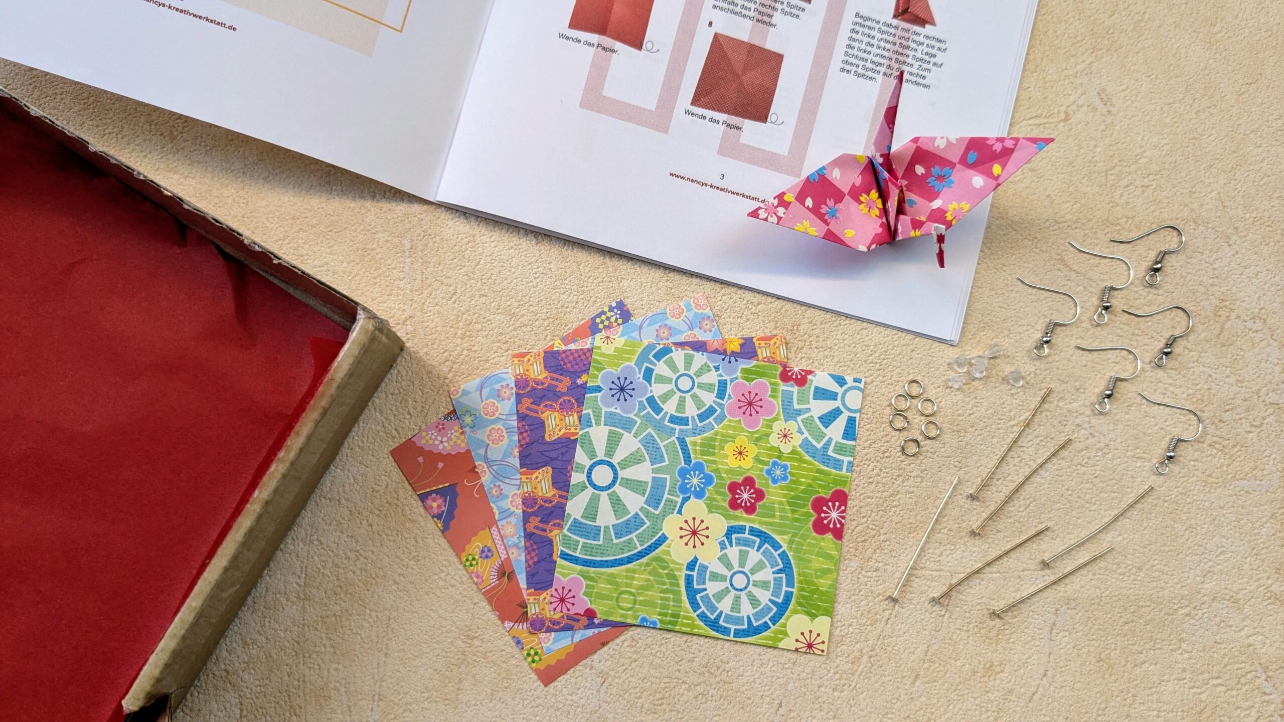 Alle Materialien in der Bastelbox habe ich sorgfältig zusammengestellt und dir eine verständliche Bastel- und Faltanleitung geschrieben. So kannst du auch als Origami Anfänger*in filigrane Kranich Ohrringe anfertigen.